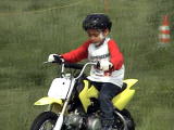 初めは一緒に乗って感覚をつかみ、飽きて来たら一緒に乗ったままハンドルを任せてみる。何とか動かせるようになったら一人で乗って、ほんのチョット進んで止まる、進んで止まるの練習。ちゃんとブレーキを掛けて止まれるようになったら徐々に遠くまで走らせてみて、ころあいを見てカーブ状にUターンさせる。