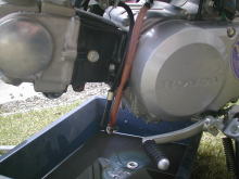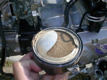 ついでにエアクリーナードレンチューブにたまった乳化オイル+水+泥を抜いておきます。これはエアクリーナーの二次側なのでココに泥が入っているってことはフィルターを通り抜けてシリンダーにも入っていってるんでしょう。