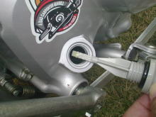 暖機の後クランクケース下部のドレンプラグを外しオイルを抜く。ドレンプラグを戻し、新しいオイル規定の600mlを入れフィラーキャップを確実に締め込んでおく。