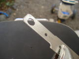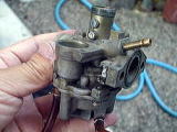 何とかなりそうなのでエンジンをやっつけておきましょうか。 現状は、 ・始動困難、キック回数多し ・暖機中エンジンストップあり ・暖機中アクセル開でエンジンストップ ・回りだすと何とかなる たしかそんな感じだったと思います。 キックペダルはまたもヤフオク中古品をゲット。バイスクリップで山の変形したセレーションを修正して、難なく取り付けOK。早速キックキック! 予想通りでやっぱりダメ。簡単なところでプラグの火を確認してから、キャブレターをばらして掃除してみることにしてみましょう。 めんどくさいのでケーブルの類は全部そのまま。エアクリーナーボックスを固定ネジを外してから横にずらし、マニホールドとキャブの取り付け部を外してフロートチャンバーをナナメに巧いこと外しちゃいます。そうすればその状態でジェットにアクセスできると。 パーツリストで部品の確認をしておきました。メインジェットの他にはスロージェットというものは無さそうで、オートチョークの回路がそれのような感じです。口径のでかいメインはあまり詰まるようなこともなく始動とも関係は薄いのでクリーナーをプシュっとしておいて済み。オートチョーク系統のフロートを通っている穴とキャブ側の穴は念入りに掃除しておきます。特にフロートの方はどうも怪しいのでじっくりと。 さくさくっと組みなおしてキックしてみるとあっさりとエンジン始動。。。が、すぐストップ。 何度やっても同じ感じ。状況は以前と変わらずというところですね。 キャブの可能性も捨てきれないところだけれども、やっぱりここはスクーターお約束のマフラーのつまりかなあ、と排気管付け根のボルトを緩めて少し排気漏れする状態を作り始動確認。 ビンゴでした。エンジン停止の原因はマフラーのつまり! 少し大きな音でアイドリングも続きアクセルにあわせ回転も上がります。 次の目標決定。マフラーの詰まり対策。 テクニカルショップに電話してマフラーのことを相談すると、在庫として旧dio用を持っているとのコト。早速10分でマフラーを外して形状あわせに向かいました。 勇んで持っていったものの、結果、合わないことが判明!残念。 「じゃ焼いたら?」 GIストーブ登場。小一時間あぶり続けエアーを吹き込む。もう、もくもくと白煙が。 断続的に続けていくとなんとマフラーからファイヤー! ![]() ほんとに出ますよ、写真みたいに。熱心に続けていくとだいぶん収まってきましたんで終了。 つけて確認はまた後日。ふふふ。
