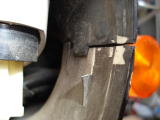 なんか、乗るんだって。弟が。 いったんはエンジンも掛かって良かった良かったというところだったのですが、しばらくほって置いたために既にエンジンは掛からなくなっていました。それで弟が一生懸命キックしたんでしょうね。せっかくのヤフオクゲットキックペダルが堂々の破損!お亡くなりになってしまいました。 なんだか何故か振り出しに戻ってしまったってことで。(笑) エンジンは掛かるのわかっているので、今のところは他から仕上げていこうかなと思っております。 実は一般走行での最大の問題は ライトが固定出来ない! ライトの固定はライトの左右に出ている棒をライトカウルの穴に差込んだ後、下からネジで光軸あわせの感じで固定するというもの。 こんな感じの丸い穴があります しかし反対側はまるっきり折れて無くなってますね。で、どうするかというと。。。穴を作ってしまいましょう。 ディックレーシングのステー。ドリルでステーに穴を開けて、幅をグラインダーで整えて、上手にクランク状に折り曲げます。んでもって、カウルに穴を開けてボルトで固定するとばっちり出来上がり。 小さい方の穴でカウルとボルトで固定します。 控えめに言って完璧です。後はどうしたものかな。必要なものというと。 ・バッテリー ・自賠責保険 ・ナンバープレート ・キックペダル お金と相談だなあ。。。ん?エンジンかかるんかな?