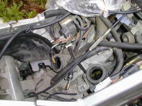 袋はアクセルワイヤーの端っこです。実はニードルまでここについたままです。オイオイ。太いチューブはインテークチャンバーで先っちょが金色の細いのはチョークです。