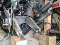 ホイールを車体から外すと支えなきゃなりません。今回は自家製ブランコ&チェーンブロック&馬で車体を支えています。本当はスタンドがあればいいんですが買うのもねえ。で、今あるものを使って済まそうとして苦労するワケです。