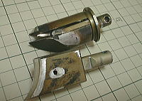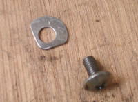 巧くはまったと思いきや、今度は抜け止めのネジが掛かる部分がありません。固定バルブが前後に動いてその部分がネジの頭の形に無くなってしまっているようです。大きな座金で押さえればよいのですが、側壁のキワにネジがあるのでそのままでは座金が入らないので、サンダーで異形座金を作りました。2個作って両方にはめます。なかなかいい感じ。