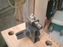 穴を開けるのに万力もなのないので、木工用の台を使って固定します。意外といい感じ。