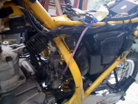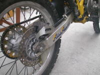 200R用を移植のアルミスイングアームもきっちりです。ただチェーンガードを止めるボルトがボルトナット式になったため125用では届かず、付けられませんでした。後はピポットのボルトが入りにくかったのと、そのボルトが入った後で、チェーンを通すのを忘れていたのに気付いたくらい。