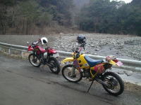 初林道ツーリングに行ってきました。なかなか難しい。アスファルトの上を普通に走るのはなーんてことないのですが、ガレ場などはハンドルは取られるケツは流れるでまともに走れませんでした。